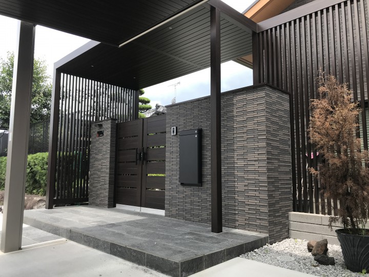 カーポート屋根と門廻り屋根を重ねて、雨の日でも濡れにくい設計となっています。