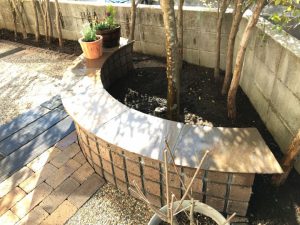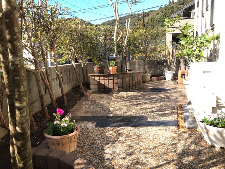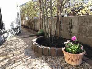 奥様のご要望でした鉢置きにも使えるベンチはとても気に入ってくださり、さっそく鉢を置いて楽しまれていただきました。