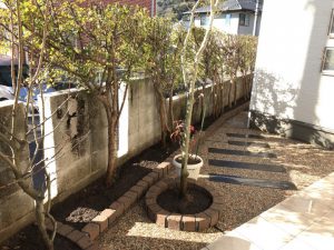 既存の生垣やシマトネリコは生かしつつ、地面を洗出しや枕木でお手入れしやすくしました。
