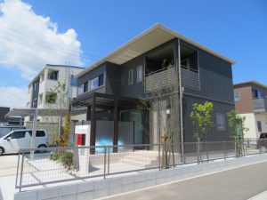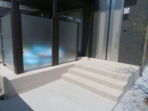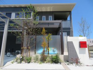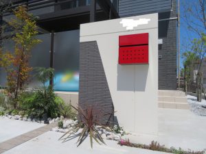 門柱にも目隠し作用と、インパクトのある配色で住宅にコーディネイトされています