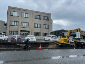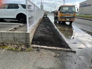 縁石際やカーブミラー下など、重機では掘れない場所は手作業ですが、なかなかの重労働でした。