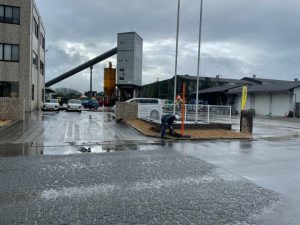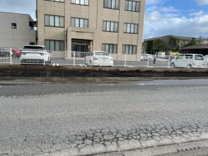 作業中、道路に土がこぼれて汚してしまうため、作業後は散水車による路面の清掃もしっかり行いました。