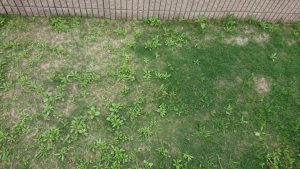 【写真左側】は肥料が少ないため、芝の根が少なく、雑草が勝ってしまっています。