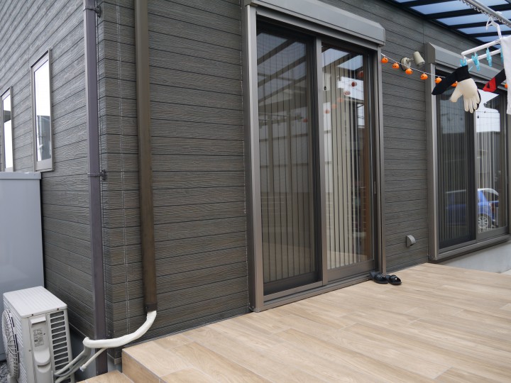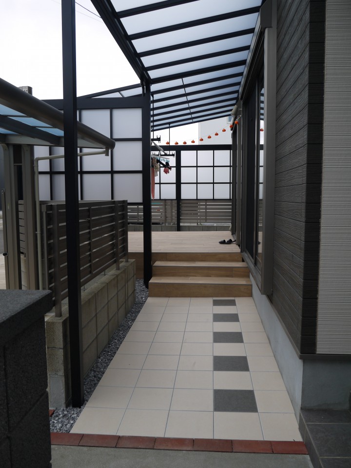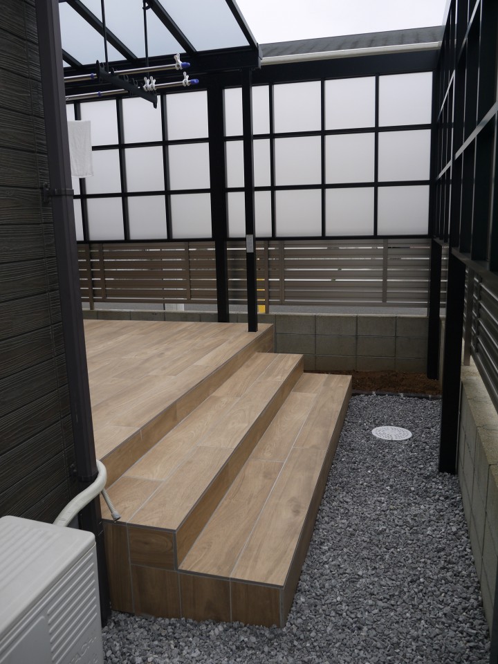 手前がサイクルスペース、奥はデッキのお話から木調タイルのテラスになりました。