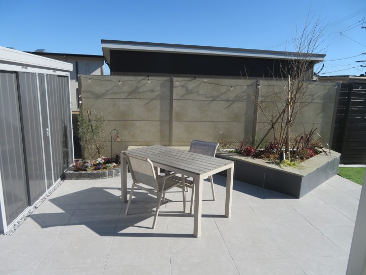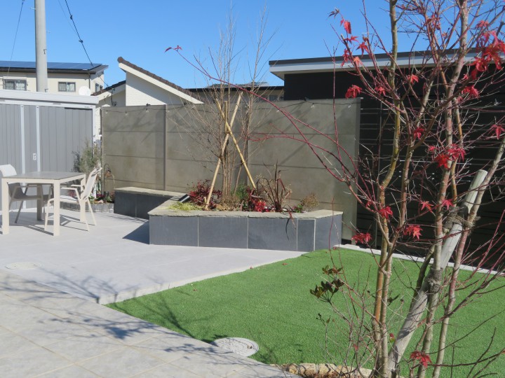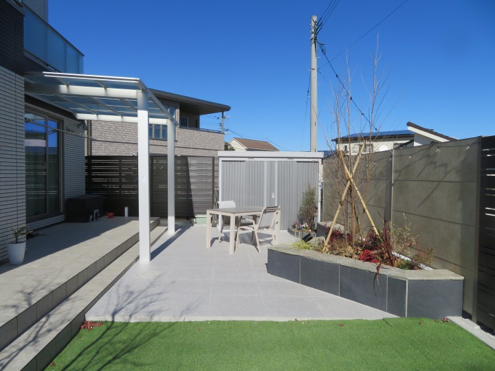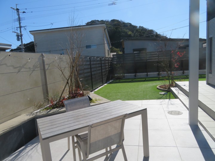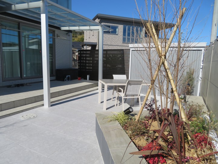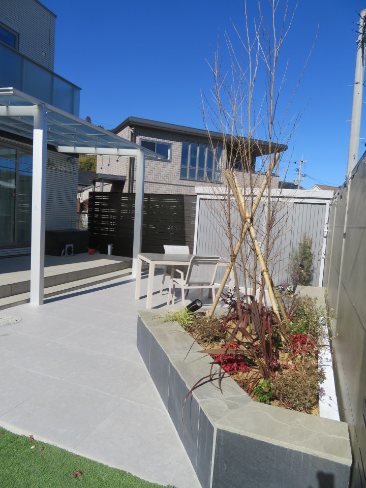 既存のタイルテラスの前にもう一つのスペースを一つ設け、隣地の2階からの目線を隠す要素を設けました