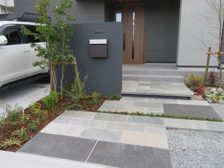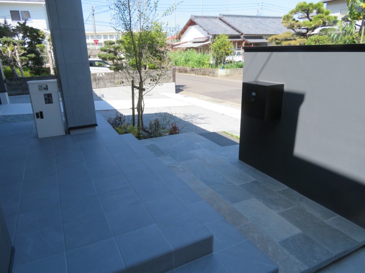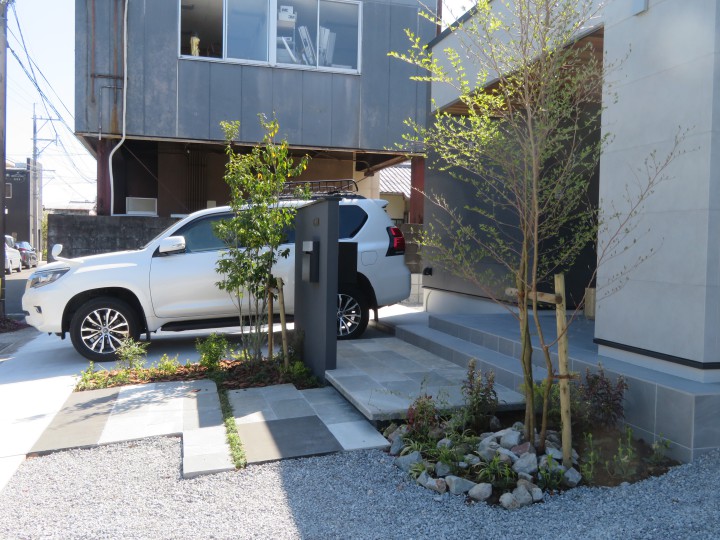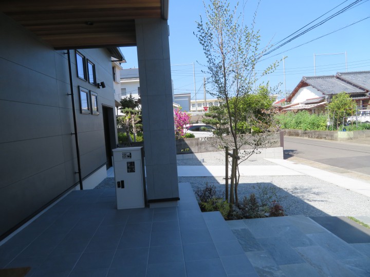 間口の広い現場でしたので、中央の玄関を意識しながら、お車を降りてからの
