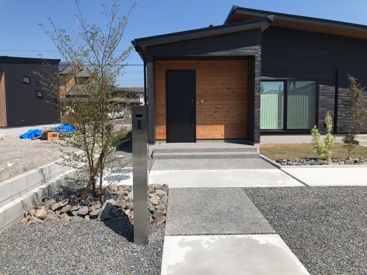 玄関アプローチには洗い出しのPX平板を配置してアクセントをつけて、