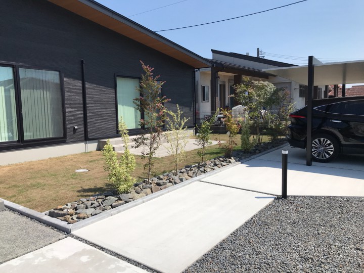 駐車スペースと庭の間仕切りとして植栽とぐり石で飾りました。