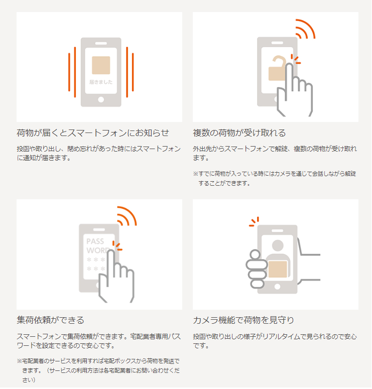荷物が届くとスマートフォンにお知らせしてくれます。また複数の荷物が受け取れ、スマートフォンから集荷依頼もできます。