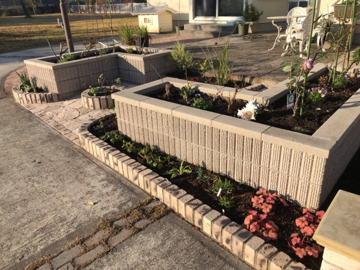 メインの植物はお手入れがしやすいように花壇を高くして、