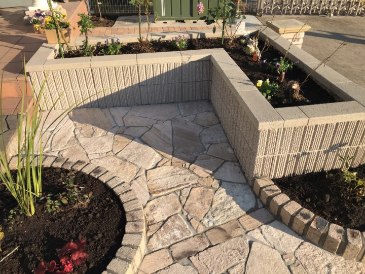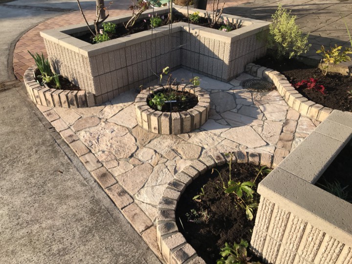 通路には自然石の乱形貼りでデザインして、おしゃれな花壇ができました。
