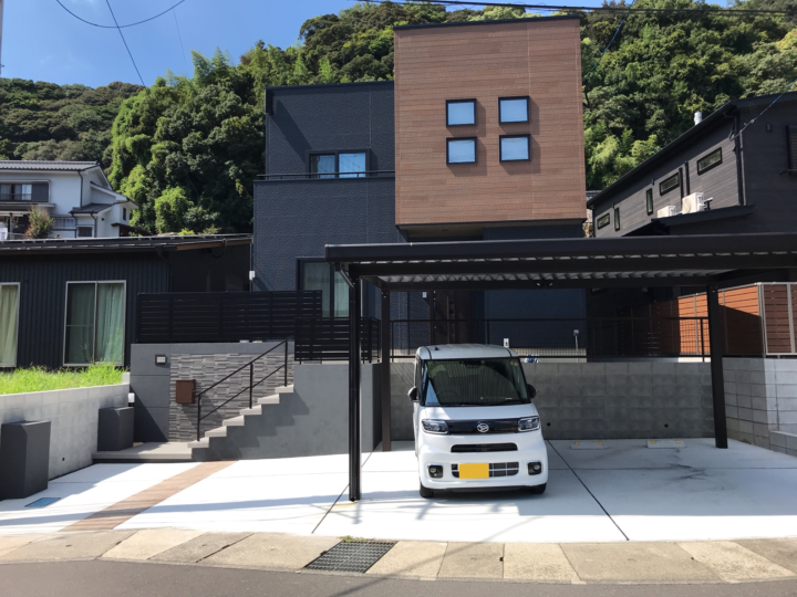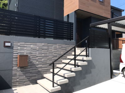 駐車場から玄関までの階段を張り出しにすることでおしゃれに見えます。