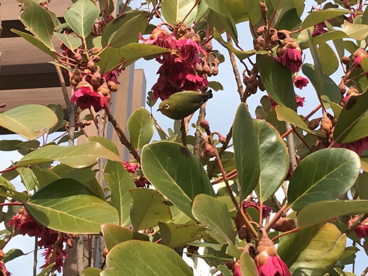 寒さがやわらいで、展示場のロドレイヤの蜜を吸いにメジロがやってきております。