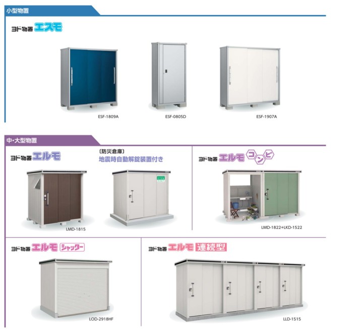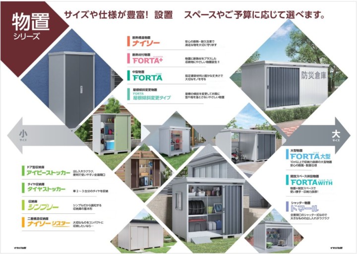 またちょっとした収納から、大型収納、シャッタータイプや、自転車置場との併用タイプ、