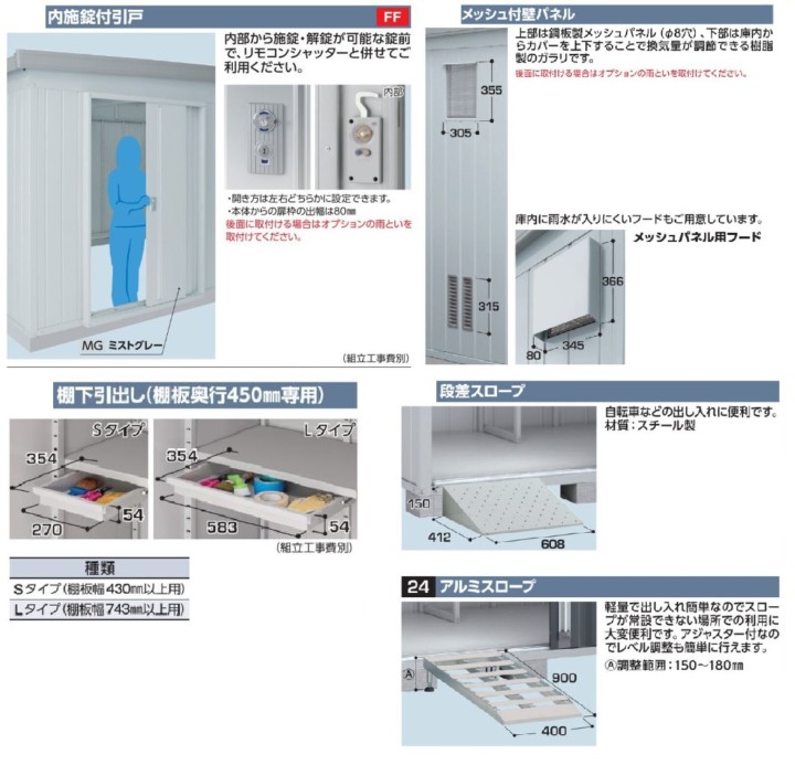 オプションも充実しており、扉・換気調整部材・収納棚・引き出し・スロープなどなど