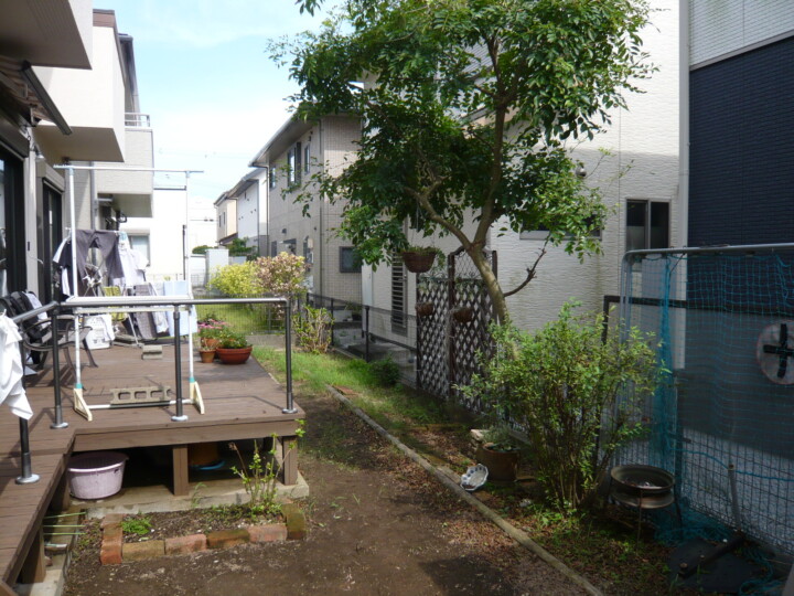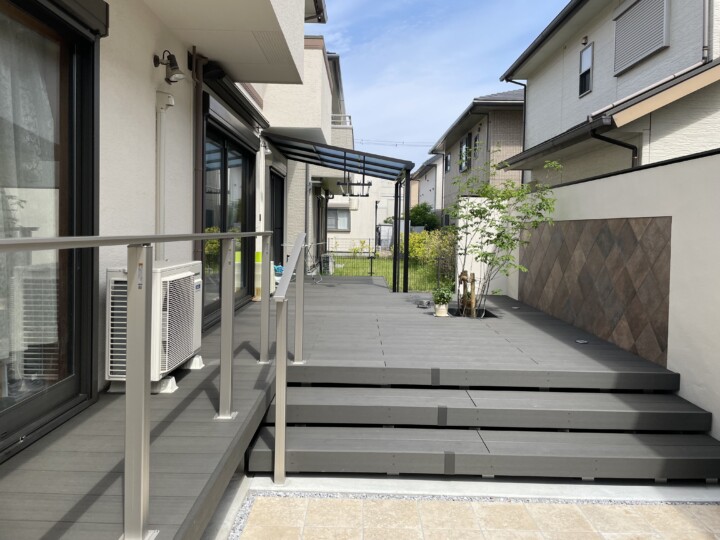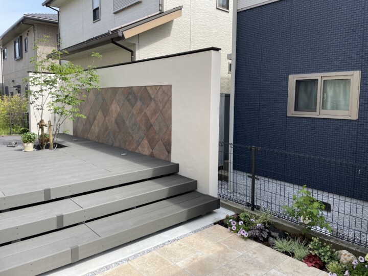古くなったデッキのやり替えと、芝を撤去した後の仕上げ、隣地との目隠しを設けました。