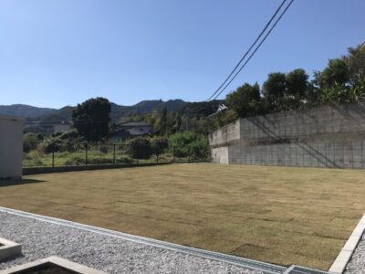 雑草が生えにくいように芝の下には試験的に防草シートを貼ってみました。