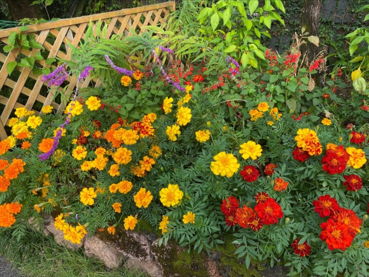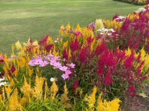 芝生の緑の中に色鮮やかなお花がとっても映えます