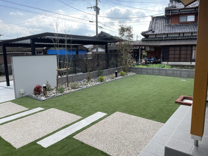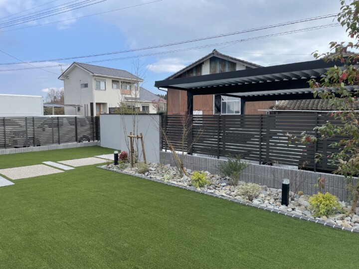 人工芝やロックガーデンでお手入れの少ないお庭が出来上りました。