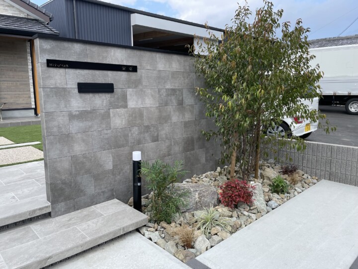 既存の石も再利用し、人感センサ付照明で夜も安心です。