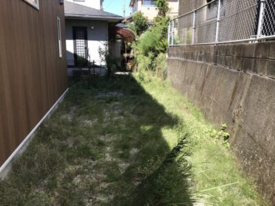 ついでに建物横のスペースも草が生い茂り何も出来ないので子供達の遊ぶスペースと物置を置きたいというご要望でした。