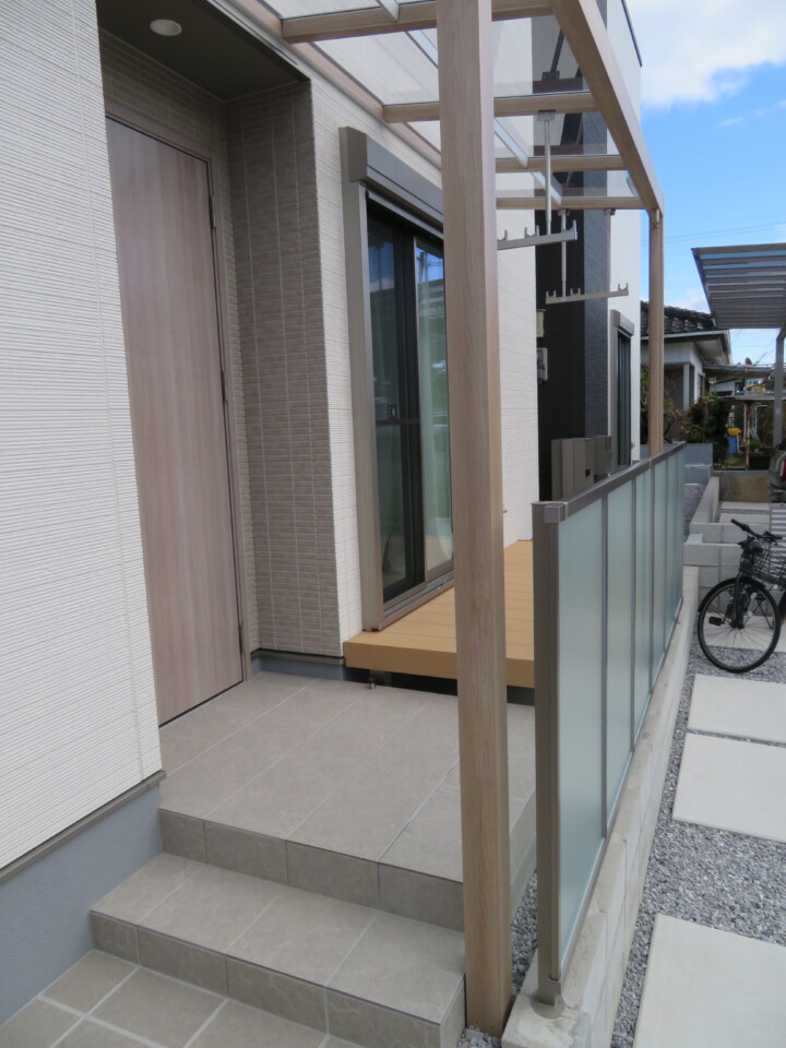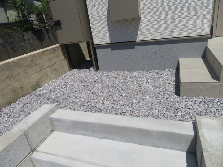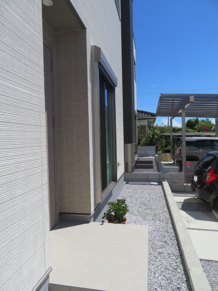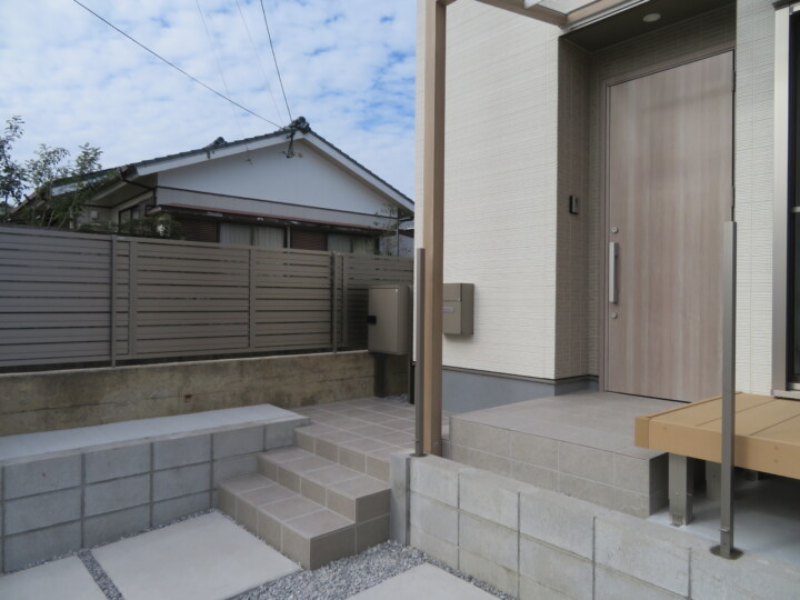 アプローチの砂利スペースもタイルを張って、玄関周りがすっきりといたしましたよ