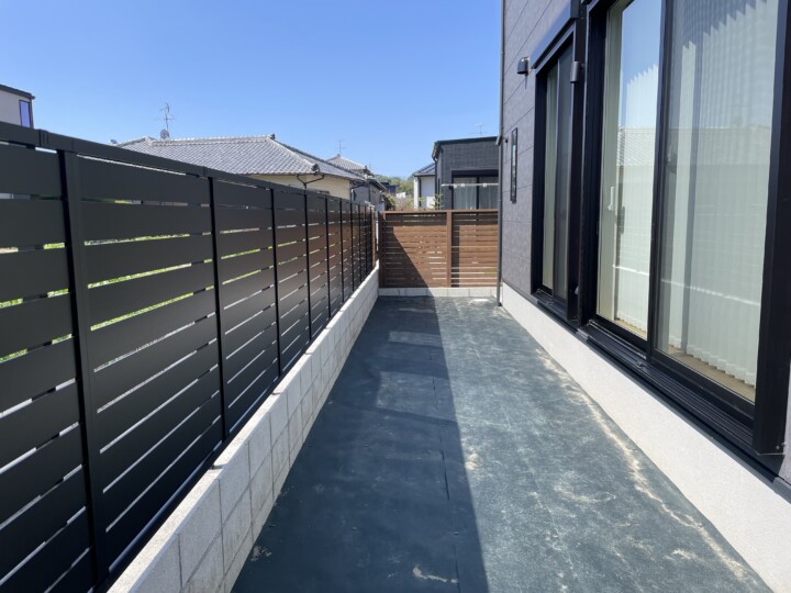 隣地との目隠しにはアルミフェンスを取り入れ、人工芝の下地まで作りました。