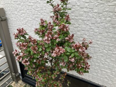 ピンク色花のシャリンバイ。あまり日が当たらない坪庭のような場所や落葉樹の根締めにもよく似合います。