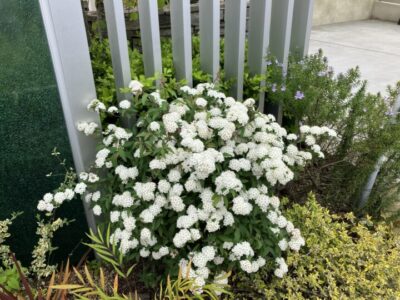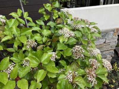 ガクアジサイに似たかわいい白花がたくさん咲くハクサンボク。葉は幅広の卵形のギザギザで光沢があります。