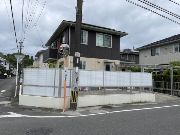 車を出す時に歩行者や車が見えるようにメッシュフェンスを併用しております。
