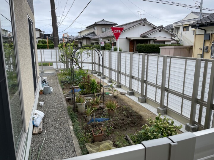車庫拡張と生垣を撤去して目隠しフェンスをしたいとのご要望でした。
