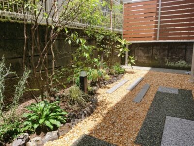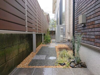 裏庭へ向かう通路も飛び石・植栽を植え間接照明もポイントで入れてみました。