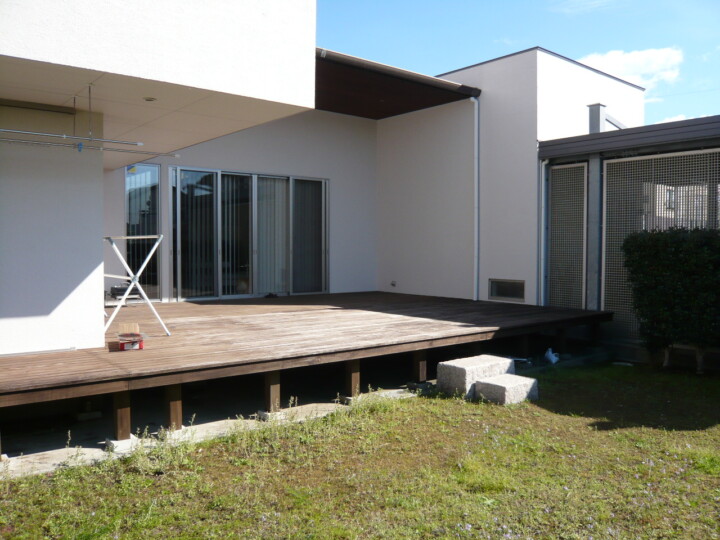 既存のデッキを撤去し、リビングの床タイルに合わせてテラスを作りました。