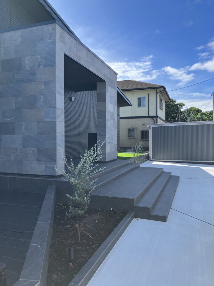玄関前に広々とした階段と、その両脇に花壇を作成しました。