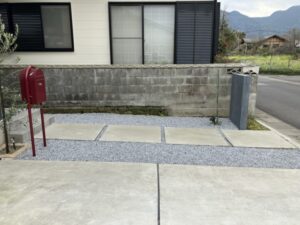 植栽はアオダモとハイノキ、足元はぐり石と砕石でシンプルに雰囲気良くなりました。