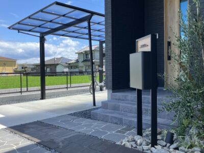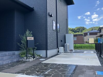 玄関周りは黒い乱形石貼りとインターロッキングでアクセントを。