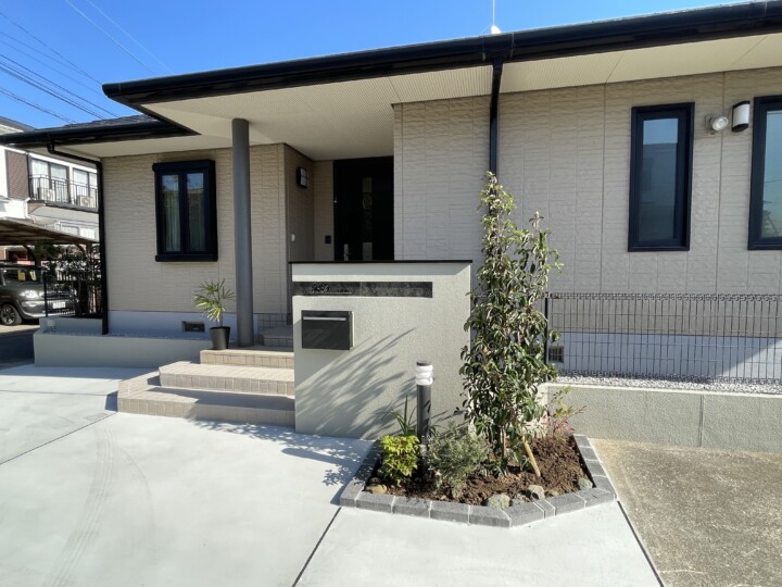 既存の門壁やアプローチ・植栽を撤去し、新しく門壁や階段などをやり替えました。