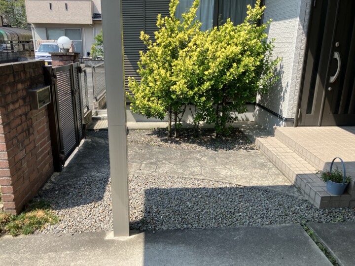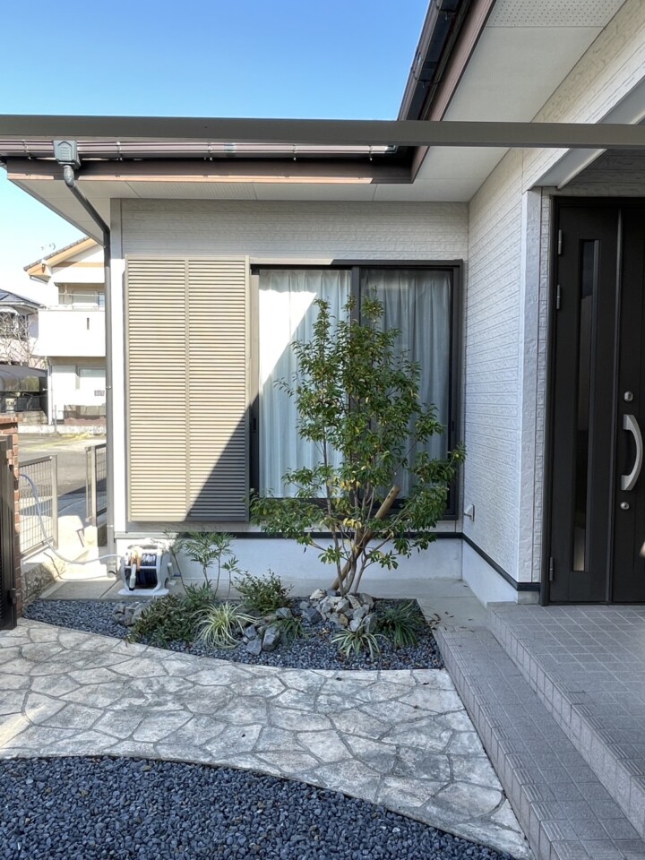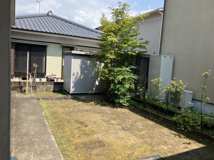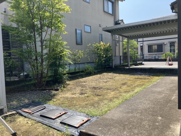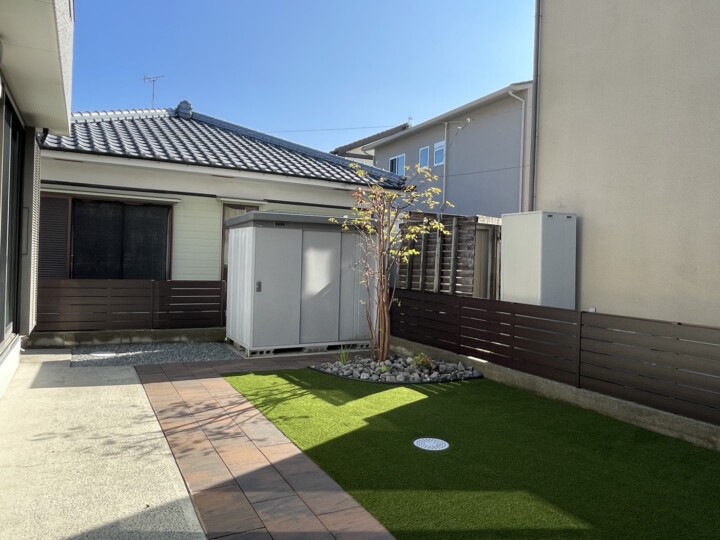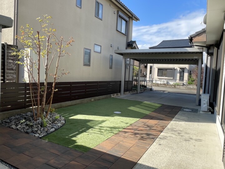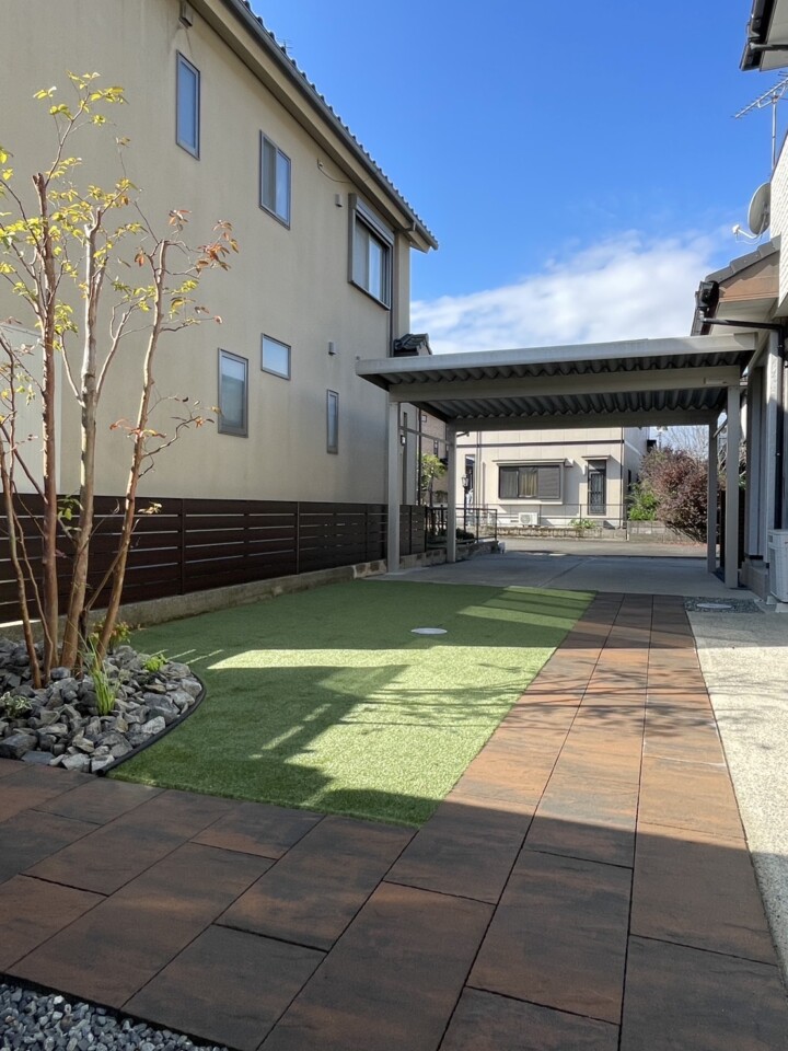 お庭は手入れのかかる木は撤去し人工芝とインターロッキングで雑草対策をしました。