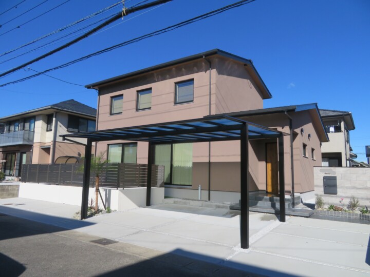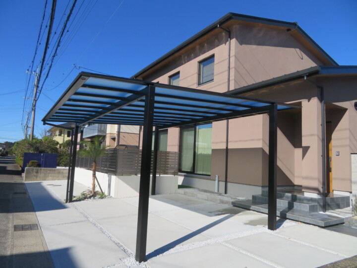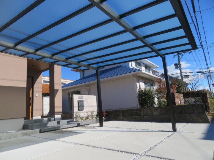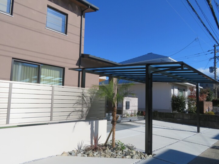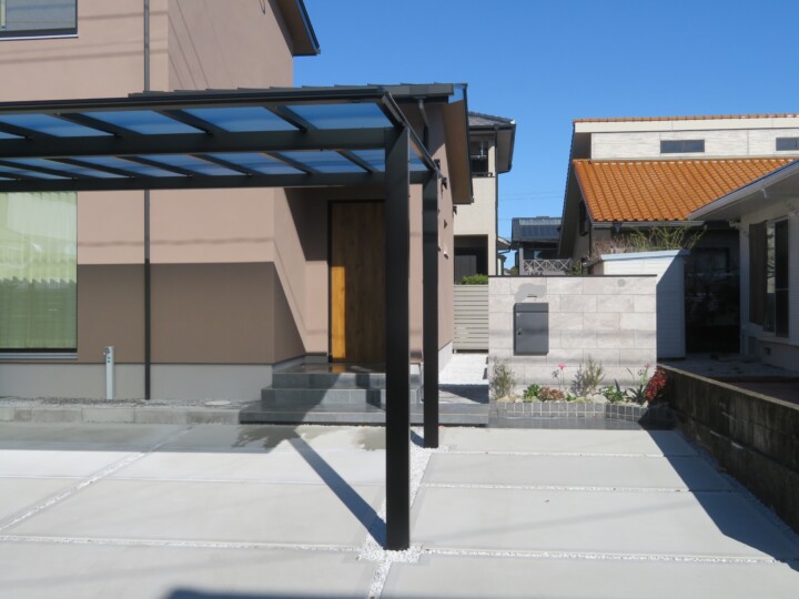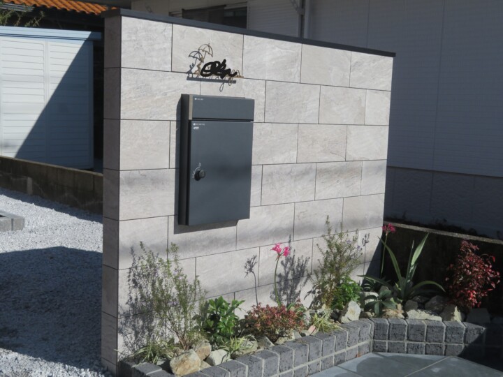 ポストと宅配Boxが大きな門壁に組み込まれて、すっきりしながらアクセントにもなり、利便性もあります