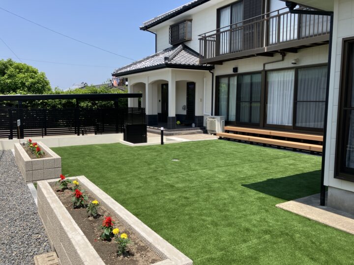 手のかからないよう人工芝を敷き詰めて一部に花壇を作成。