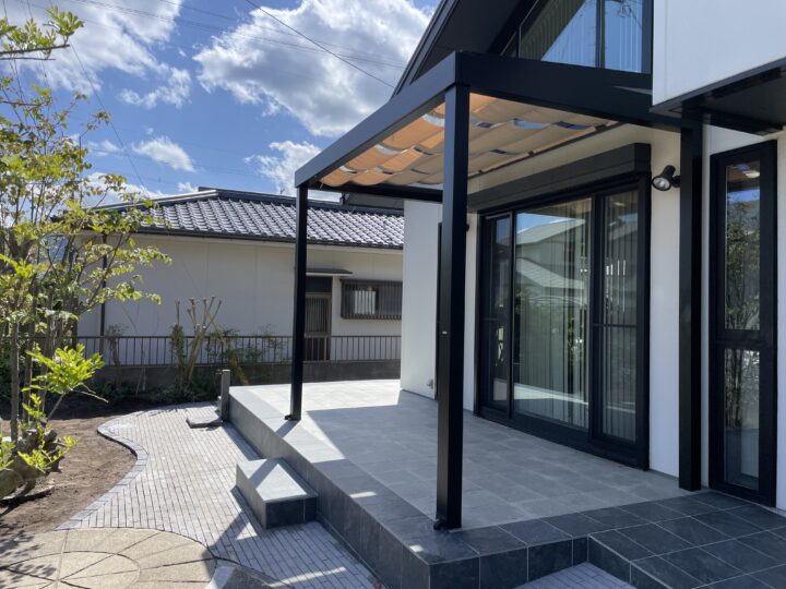 ジーマテラスは建物に合わせてブラックです、シェードもつけました。