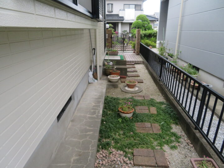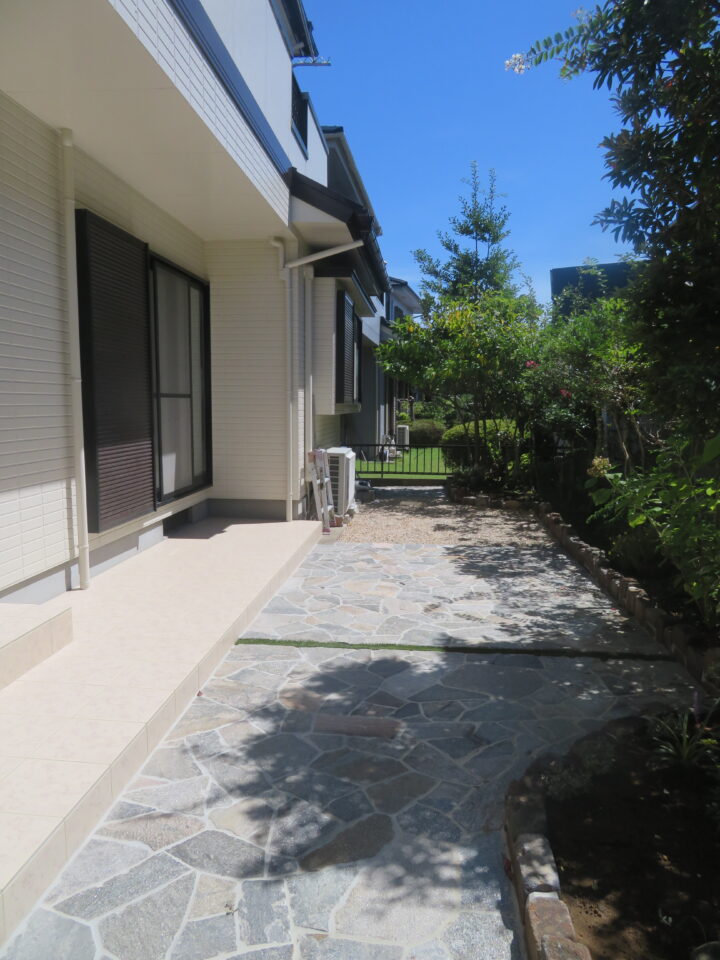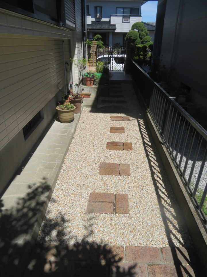 既存のレンガの敷石を利用して、新しく防草シートに化粧砂利を敷き詰めました