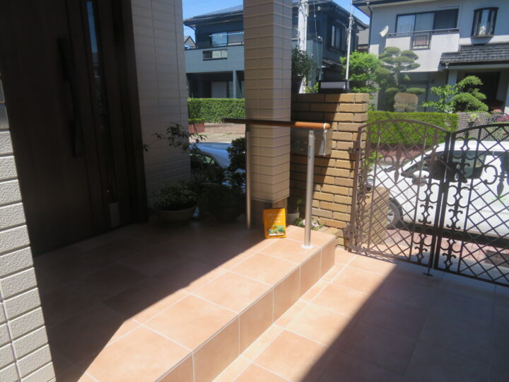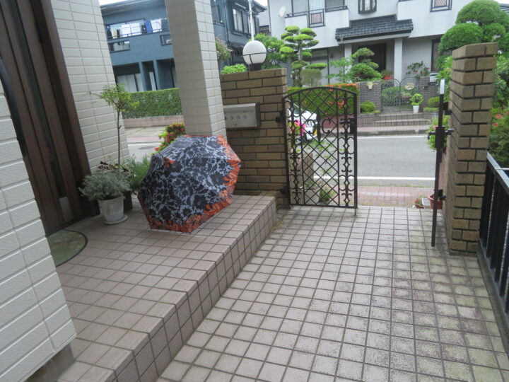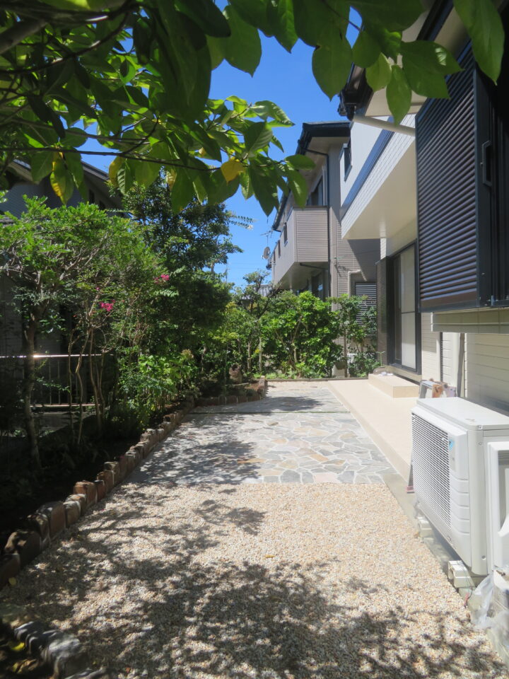 奥側には、縦格子のフェンスでお隣様の窓が、見え隠れしています