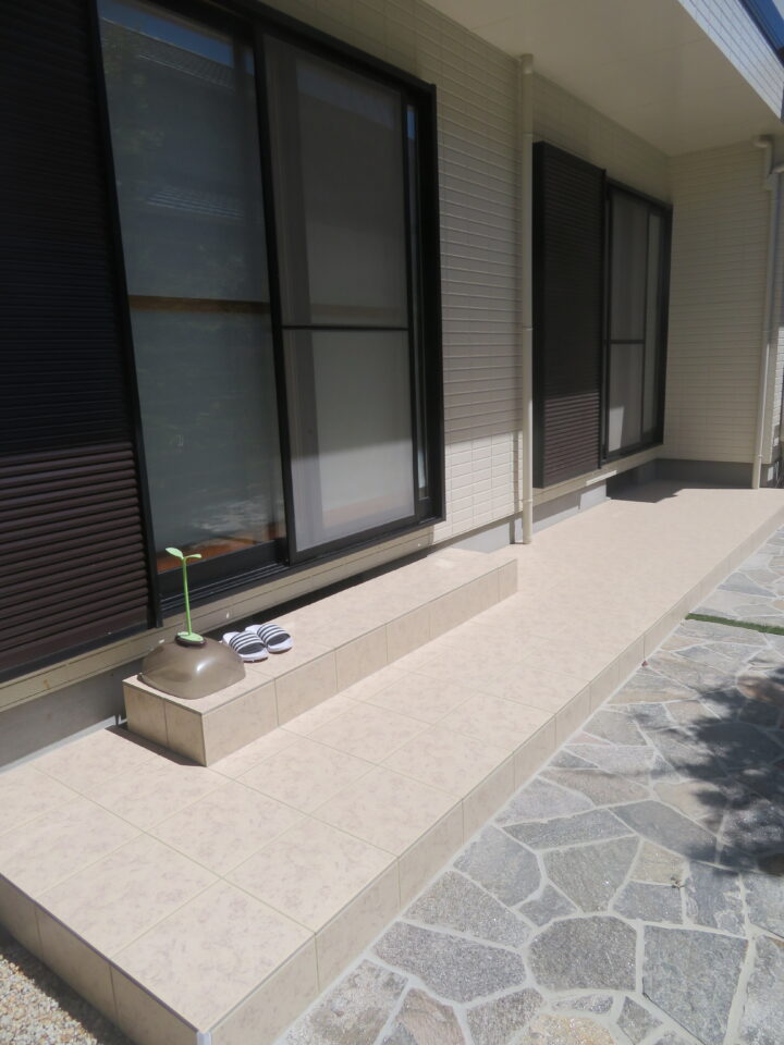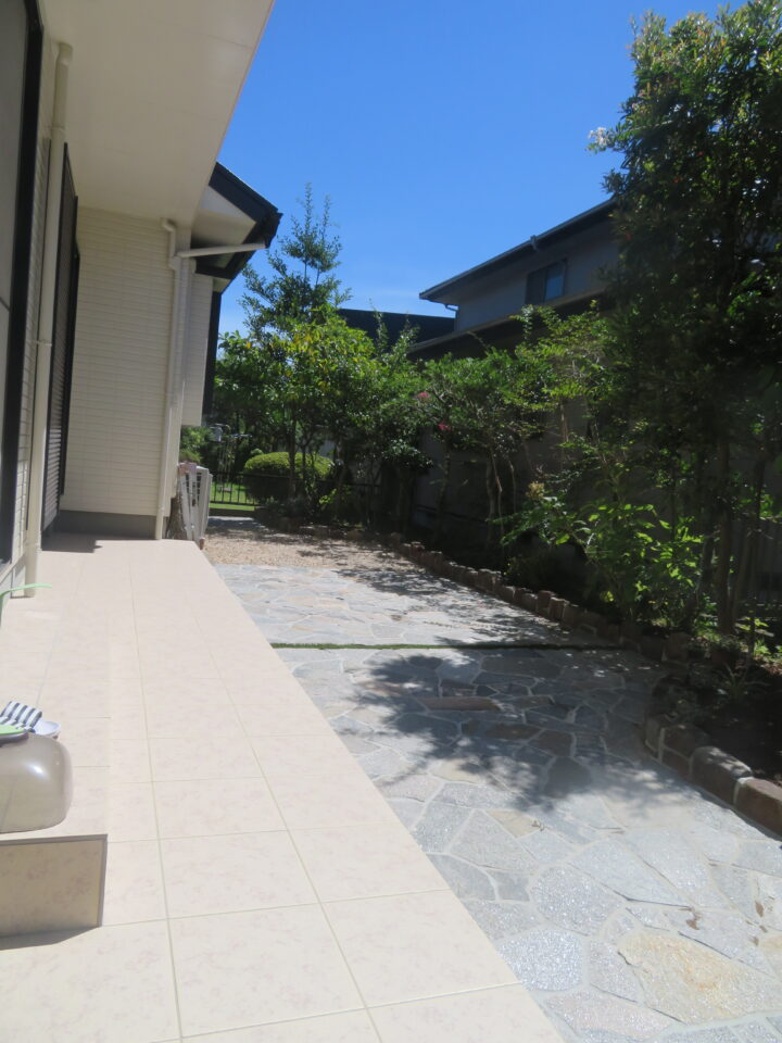 既存の花壇の大きさを少し縮小して、洗濯物を干すためのタイルテラスと
