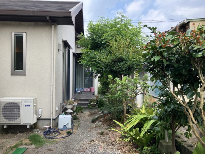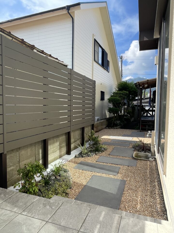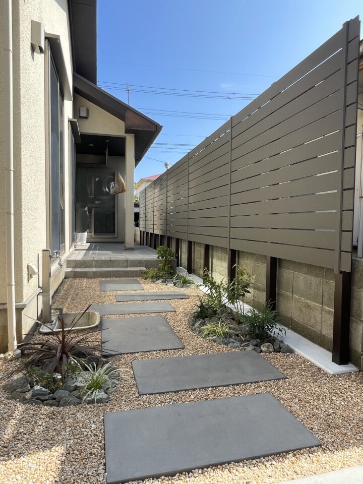 大きくなった木を整理し、アプローチは飛び石へ大判タイプを使用したので歩きやすいです