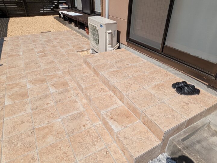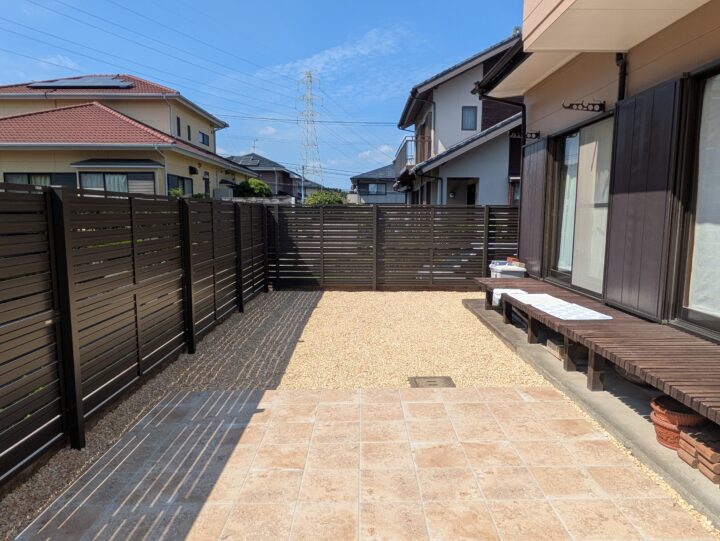 防草シート等で雑草対策、リビング前にはタイルを貼りました。