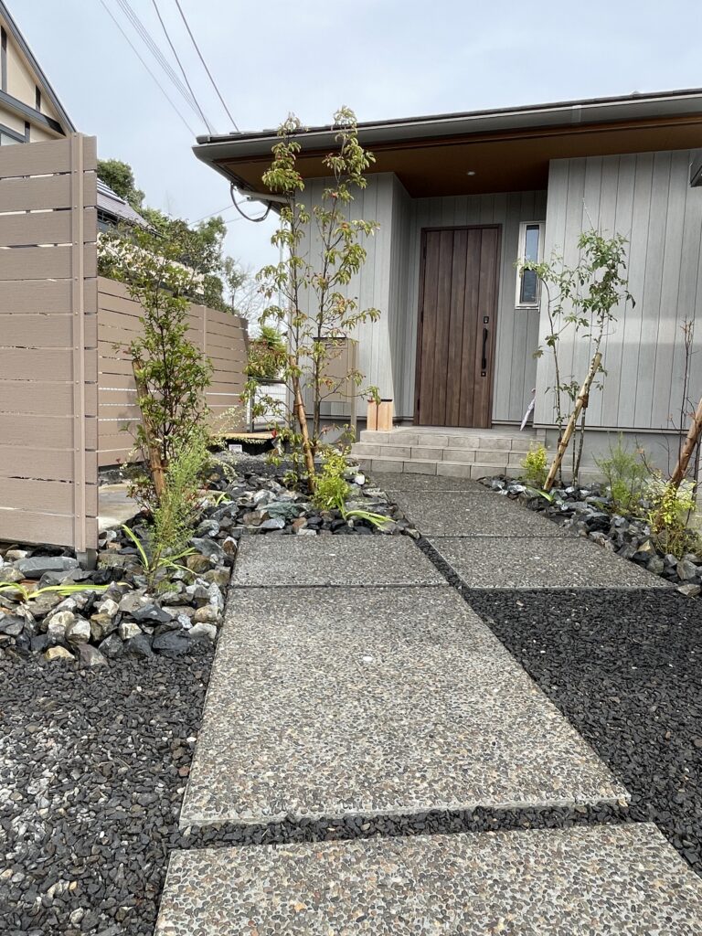 アプローチは斜めにし洗い出し仕上げです。ぐり石と植栽で季節を感じる外構になりました