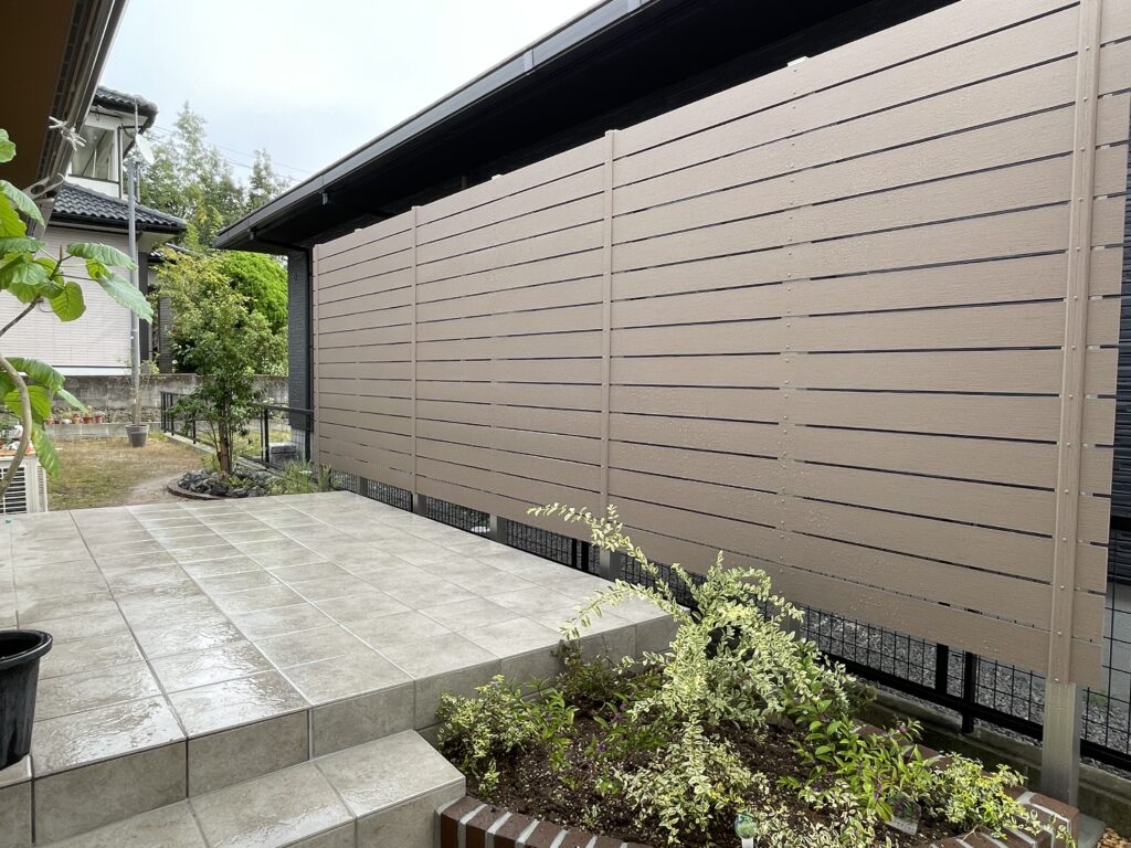 目隠しフェンスは高さがありますが植栽と組み合わせて素敵な空間になりました。